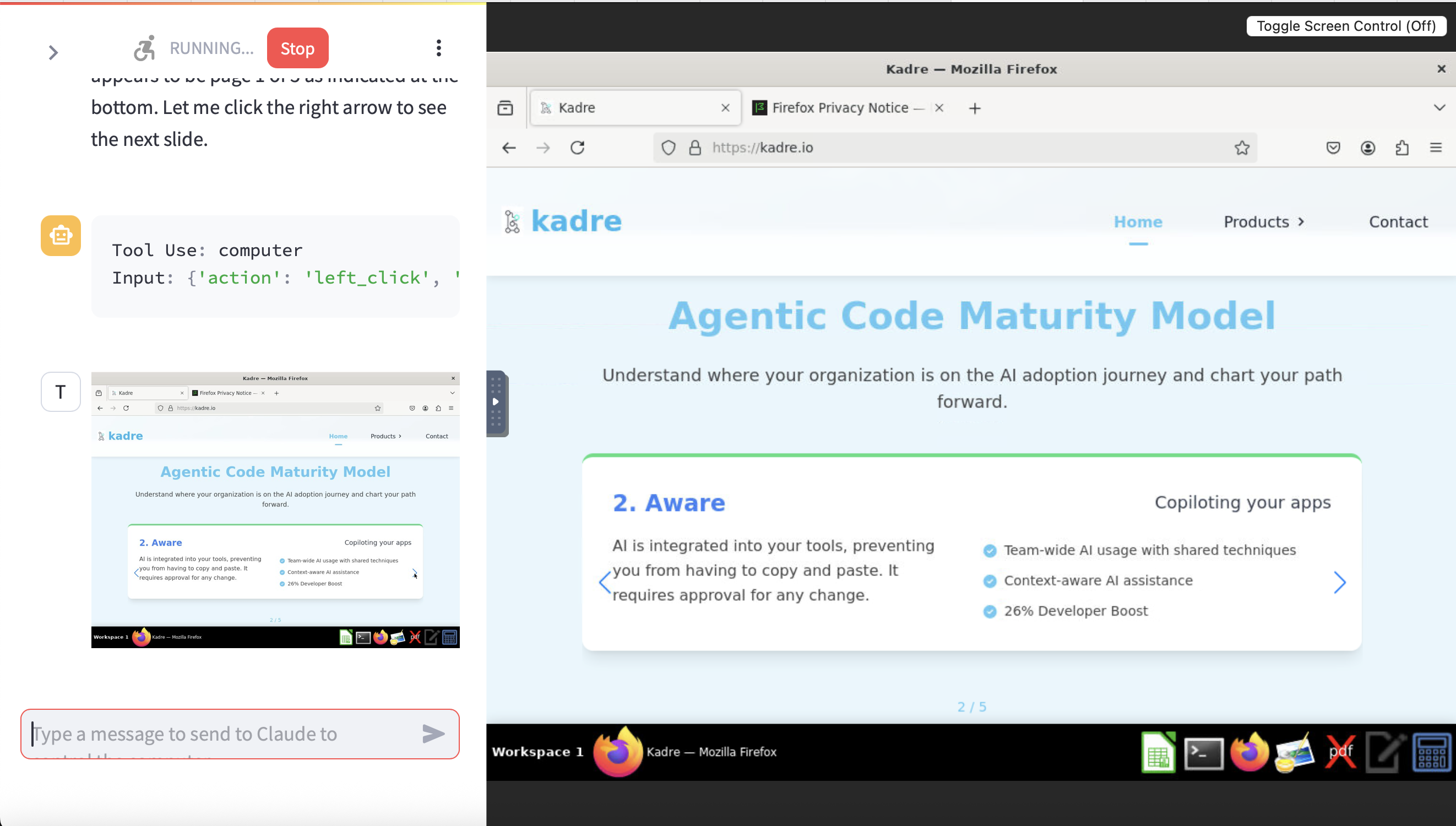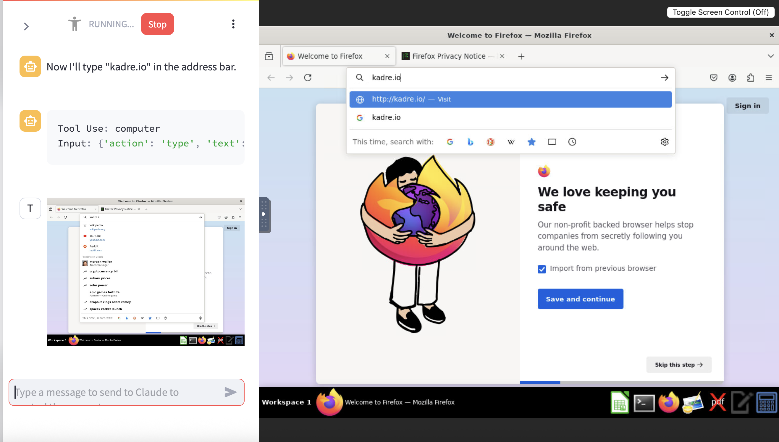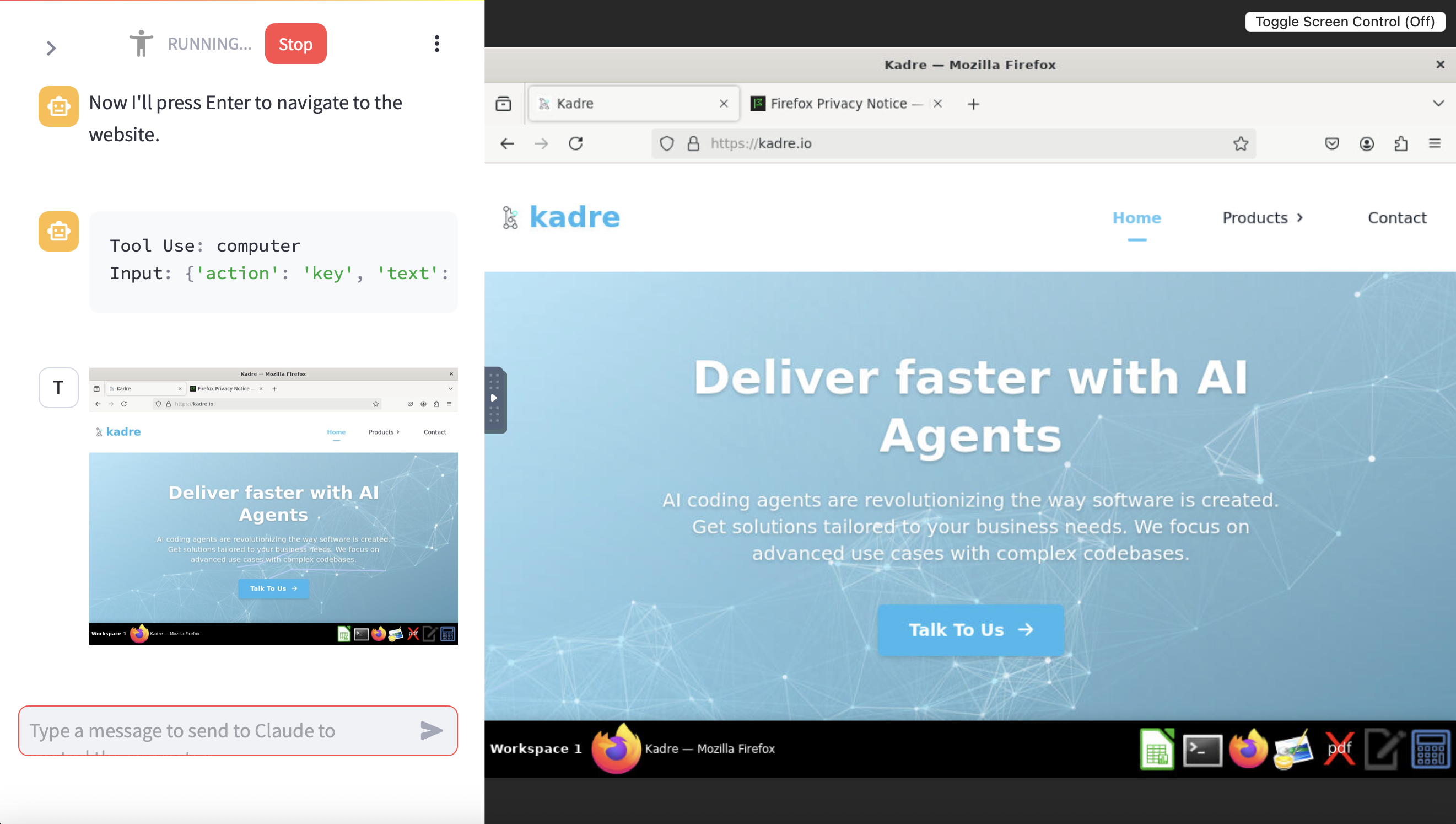 After giving it a very simple prompt to find issues with my site, it was off to the races, booting up firefox, navigating to my production site. It operates by taking a screenshot, “looking at it,” deciding on an action like typing in text, or hitting enter to navigate, and then screenshotting after the action is complete.